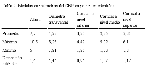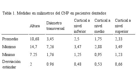 En la variable altura se determina que en los pacientes dentados se presenta alturas mayores en relación a dimensiones presentadas en los pacientes edéntulos con una desviación estándar de 1,4mm. Las medidas que se determinaron a nivel inferior, medio y superior en las corticales del diámetro del CNP en pacientes dentados son menores en relación a las medidas obtenidas en los pacientes edéntulos.