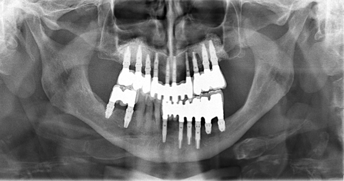 Se observa radiográficamente como los dientes remanentes presentan un mal estado periodontal, por eso se procede a la realización de un tratamiento periodontal y extracción del molar del cuarto cuadrante antes de la inserción de los implantes