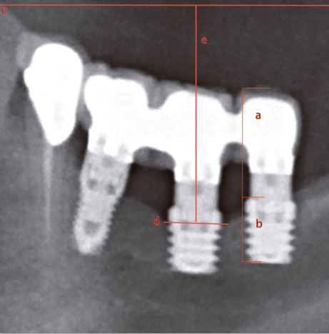 Para establecer proporción corona-implante, el Crown Heigh Space (CHS) y la pérdida ósea se utilizaron radiografías panorámicas calibradas. Todos los pacientes se posicionaron según un protocolo estricto. Una vez obtenida la radiografía se calibró mediante un software específico (Sidexis, Sirona, Sirona Dental Systems, Bensheim, Germany) a través de una longitud conocida dentro de la misma como es el implante dental. Con la medición calibrada, ya pueden realizarse medidas que serán reales (escala 1:1) sobre la radiografía.