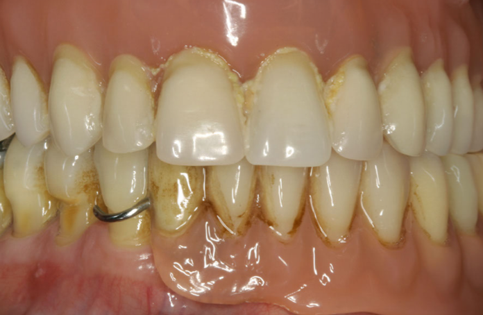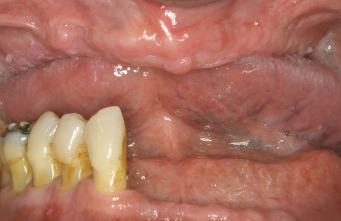 Se observa en ambos maxilares, que al retirar las prótesis removibles, el paciente presenta atrofía ósea subyacente
