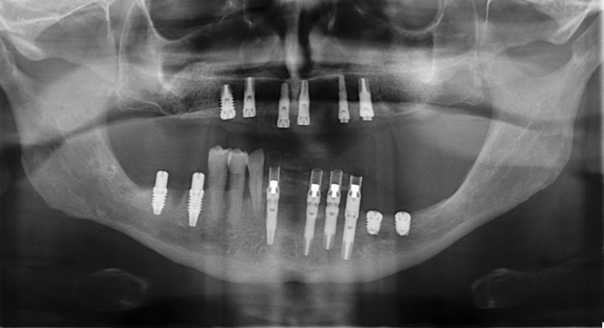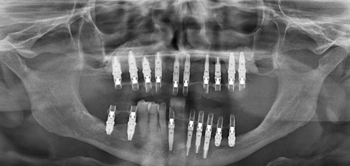 La radiografía posoperatoria tras la inserción de los implantes superiores e inferiores, muestraademás que al paciente le fue realizado una elevación de los senos maxilares para inserciónfutura de más implantes en los sectores posteriores maxilares. En ella puede evidenciarse losimplantes extracortos del tercer cuadrante que se dejan sumergidos mientras el resto deimplantes de ese cuadrante y los de la zona anterior del cuarto se incluyen en una prótesis decarga inmediata.