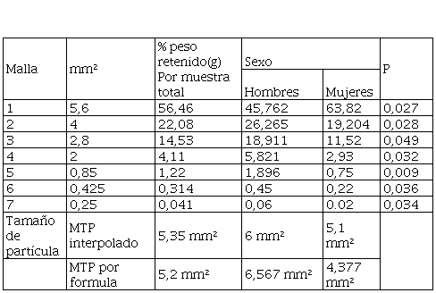 A continuación, se presenta en la Tabla 1 el porcentaje del peso retenido de partículas secas en cada malla y el desempeño masticatorio en hombres y mujeres, determinado por la mediana de tamaño de partícula (MTP), tal como puede observarse en las Figuras 1 y 2.