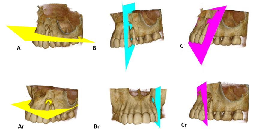 A. Axial oblicuo (Amarillo), B. Sagital oblicuo (azul), C. Coronal oblicuo (magenta), Ar. Referencial Axial Ortogonal (amarillo), Br. Referencial Sagital ortogonal Azul) y Cr. Referencial Coronal ortogonal (magenta)
