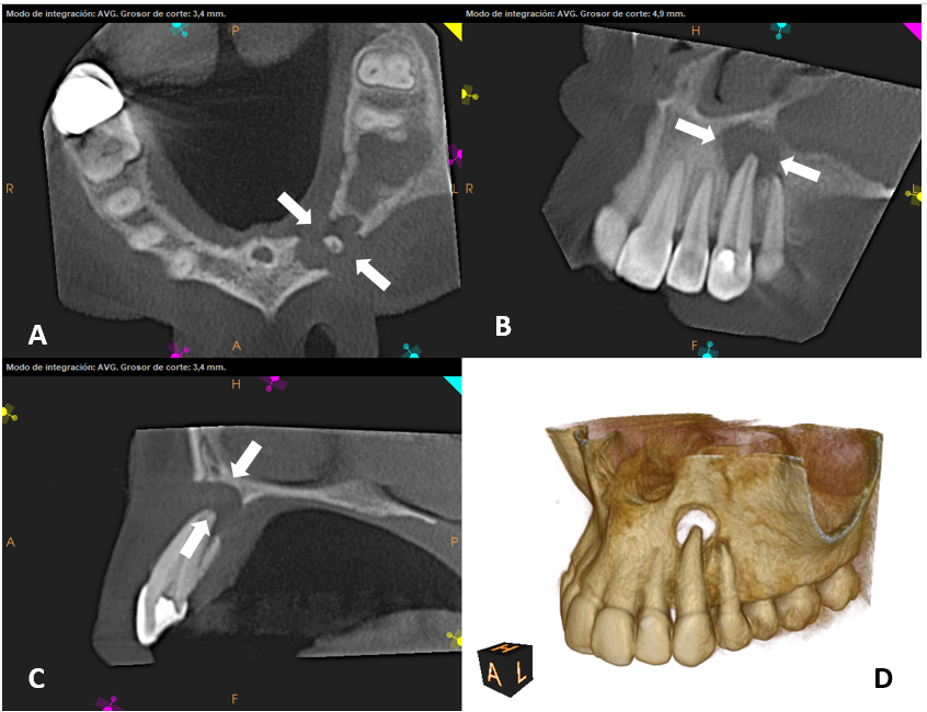 En las vistas axial (A), coronal (B), sagital (C) y volumen (D) se señala con flechas de color blanco, lesión hipodensa compatible con lesión apical crónica en el diente 23.
