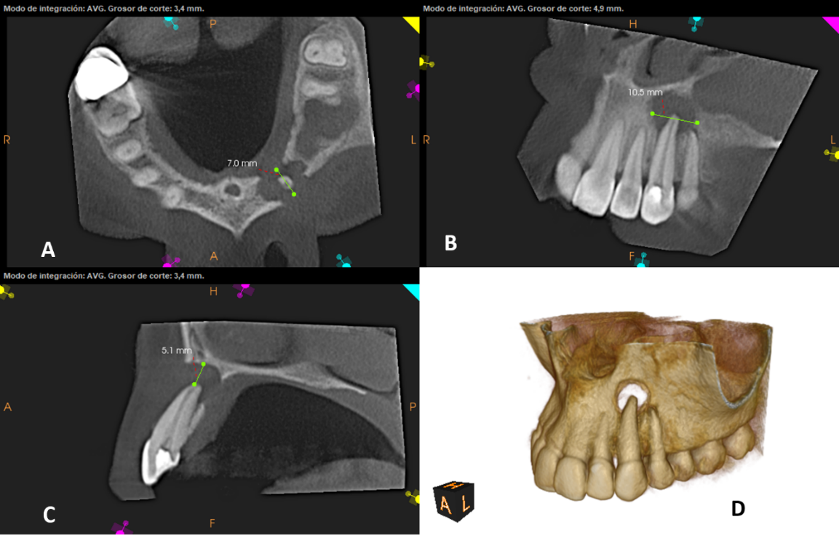 Recientemente, algunos artículos clínicos han documentado el uso de imágenes de CBCT para la evaluación postoperatoria en cirugía apical realizando mediciones que permiten comparar la cicatrización del tejido (21, 22). Uno de ellos propuesto por Torabinejad, en 2017, determina el tamaño de las lesiones periapicales a partir del uso de CBCT en reconstrucciones multiplanares sagitales y coronales, y la medición del área más amplia de radiolucidez en la región periapical adyacente al ápice (23). Pese a ser un estudio tomográfico multiplanar, no se considera la vista axial, no establece puntos de referencia anatómica para las mediciones y no realiza la exploración tomográfica en los planos oblicuos dentarios, sino en los planos ortogonales. No obstante, la precisión, exactitud y reproducibilidad en la observación tomográfica de los tejidos, la variabilidad y subjetividad entre las condiciones de medición y observación son evidentes (24).