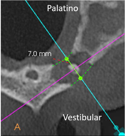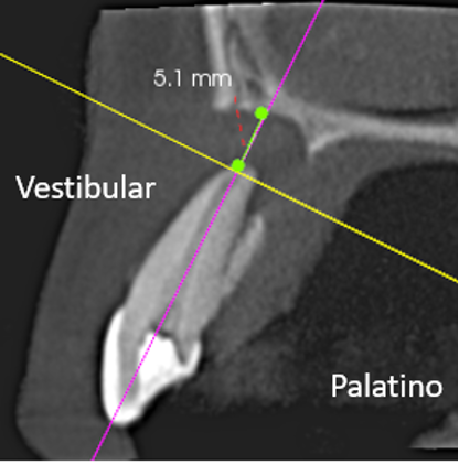 ● Profundidad de la lesión: es la medida en mm de la distancia entre los límites anatómicos vestibular y lingual o palatino de la lesión observada en el corte axial oblicuo, a ras del ápice dental de referencia.