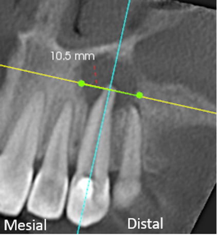 En color verde se muestra la medición de la profundidad de la lesión en el corte axial oblicuo en diente 23. El plano sagital oblicuo (línea azul) coincide con el eje sobre el que se toma la medición. Las líneas punteadas en verde son referenciales, usadas en los casos en los que los límites de la lesión no son evidentes, estas unen los límites óseos contiguos que sí son evidentes.