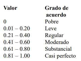 31. Landis J, Koch G. La medición de la concordancia del observador para datos categóricos. Biometrics. 1977; 33: 159–174.