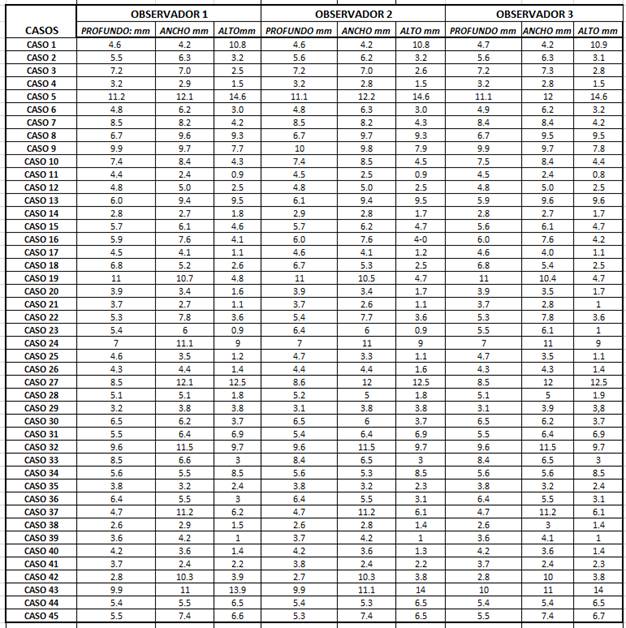 El mayor grado de acuerdo se observó entre las observadoras 1 y 2 en la vista sagital, al evaluar la altura de la lesión (ICC: 0.9997545). Las observadoras # 1 y # 3 lograron el mayor grado de acuerdo en la vista axial (ICC 0.9996737, IC 95%) al evaluar la profundidad de la lesión.