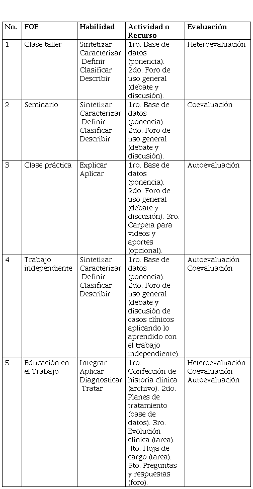 De acuerdo con lo expuesto, la estrategia docente que se trasladó al entorno virtual fue fundamentalmente para soportar las clases prácticas y la Educación en el Trabajo. Para las primeras, el residente mostró un manejo de la parte práctica del tema en su ponencia, tanto por medio de actividades clínicas como de laboratorio (incluye toma de impresión para confección de modelos de estudio y de trabajo, vaciado de la impresión y confección del modelo, diseño y confección de aparatos, entre otras actividades de promoción de salud y prevención que forman parte de los objetivos de su año). Además, logró subir a la plataforma videos cortos originales o de Internet sobre el tema. En lo conveniente a la Educación en el Trabajo, se integraron los conocimientos del tema y se aplicaron en la solución de casos clínicos simulados, en los cuales el residente tuvo que diagnosticar y tratar. Las discusiones clínico-radiográficas corresponden a esta FOE, en la que los casos propuestos pudieron ser propuestos por el docente o por los mismos residentes.
