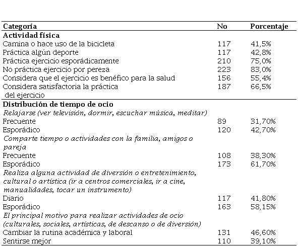 De otro lado, en la dimensión Distribución de Tiempo de Ocio, prácticas de relajación como dormir, escuchar música o ver televisión son esporádicas (42.7%); compartir con la familia, amigos o pareja no es tan frecuente (61%). La realización de actividades culturales o de entretenimiento se da de acuerdo con el nivel de interés y de gusto por las mismas; están presentes en el 100% de los participantes, ya sea que su práctica se dé diaria o esporádicamente (41.8%-58.15%).