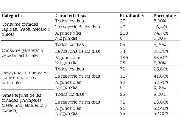 Los resultados obtenidos en la encuesta dan cuenta de las prácticas alrededor de la alimentación y los hábitos de consumo: el ingerir comidas rápidas (comida chatarra) se está asumiendo como un estilo de vida; este tipo de alimentos está tomando popularidad entre los escolares y se acude a ellos la mayoría de los días o algunos días dentro de sus jornadas laborales o escolares (16.4%-74.7%). La ingesta de bebidas gaseosas o artificiales es coincidente con el consumo de la comida chatarra (23.6%-56.6%). Dentro de los patrones de alimentación, es común tener tres momentos de alimentación representados en el desayuno, el almuerzo y la cena, con horarios establecidos; esta práctica se realiza la mayoría de los días, pero en ocasiones no se respetan las horas habituales, que están afectadas por situaciones propias del quehacer de los escolares (41.6% - 32.7%). En ocasiones se omite alguna de las comidas principales (32.4%). En general, es posible decir que los jóvenes no tienen dificultades de disponibilidad y acceso a los alimentos (Ver tabla 2).