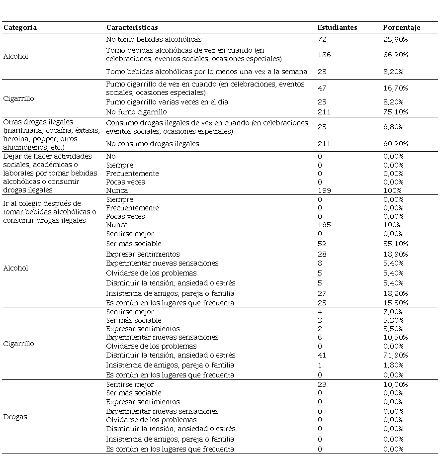 En lo referente a los hábitos y comportamientos sociales, el consumo de bebidas alcohólicas se hace de manera esporádica, generalmente en reuniones y eventos sociales (66.2%). Esto los hace sentir más sociables (35.10%) y, asimismo, les permite expresar sentimientos; se bebe por insistencia de los amigos, no es común el uso de cigarrillo y fumar no se constituye como un hábito dentro del grupo de encuestados (75.10%). No obstante, cuando se acude a esta práctica se hace para disminuir situaciones de estrés o ansiedad (71.95) o para experimentar nuevas sensaciones y olvidarse de los problemas (10%). No es común el uso de drogas o sustancias ilegales (90.2%). De igual modo, las actividades académicas y sociales se anteponen a la inhalación o ingesta de sustancias y bebidas alcohólicas; los encuestados no asisten a clases bajo los efectos de sustancias psicoactivas o bebidas embriagantes. En general, este grupo de adolescentes considera que sus hábitos sociales no significan ningún problema y no son entendidos como un riesgo en sus relaciones interpersonales y de tipo social. Algunos de los participantes quisieran modificar sus prácticas y hábitos sociales, sin obtener resultados positivos pues no cuentan con la información u orientación que motive un cambio en sus comportamientos sociales. Los participantes son conscientes de que el consumo de alcohol y cigarrillo no es necesario para el esparcimiento y, además, puede generar deterioro en las condiciones de salud, afecta las relaciones interpersonales y el rendimiento escolar. Los encuestados refieren que, si se quisiera acceder al consumo de alcohol, cigarrillo o sustancias prohibidas, cuentan con los recursos económicos y el conocimiento de los sitios de distribución (ver Tabla 3).