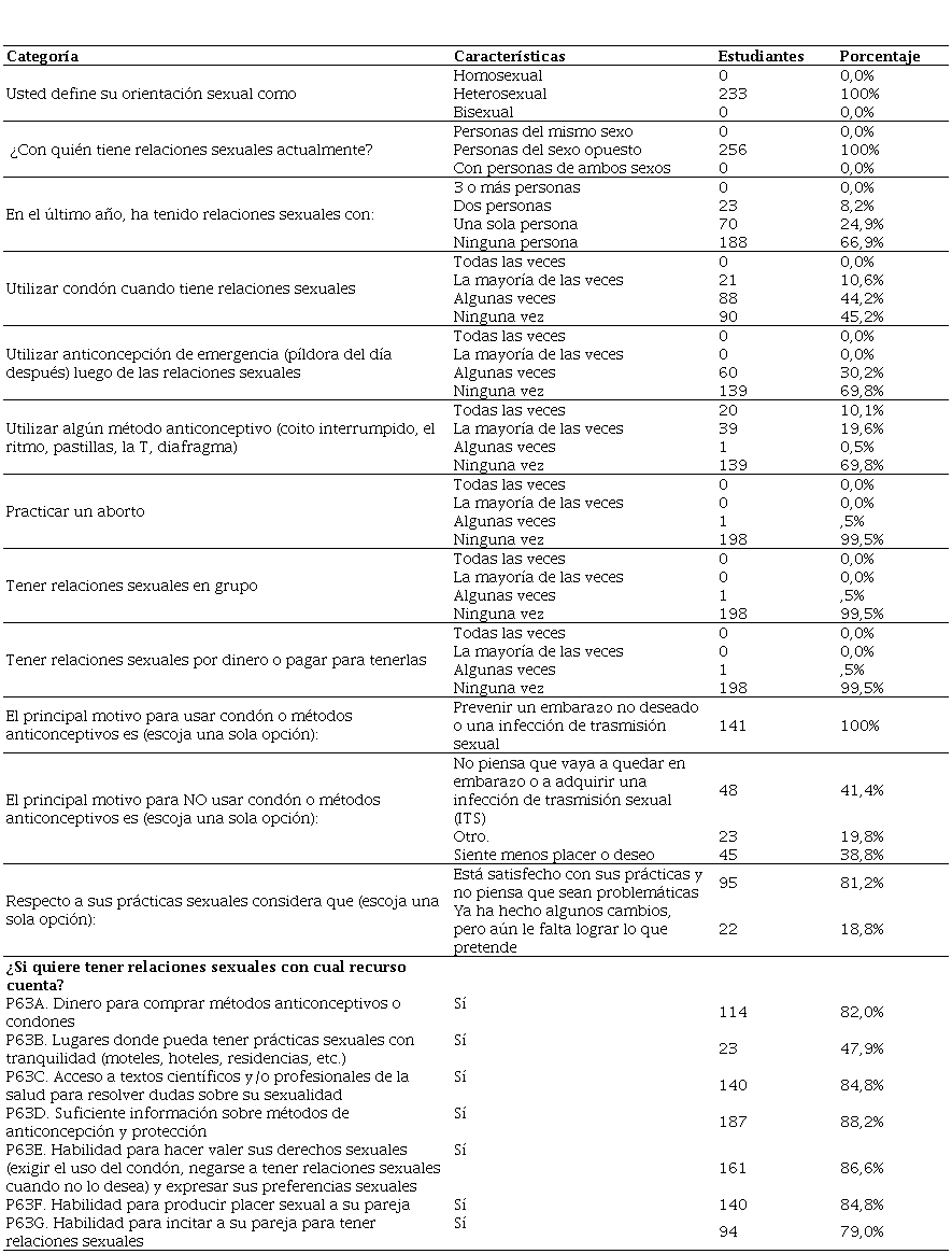 El 100% de los encuestados manifiesta ser heterosexual y dicen tener relaciones actualmente con personas del sexo opuesto. Con respecto a las relaciones sexuales, estos jóvenes no han tenido relaciones con ninguna persona en el último año (86.9%) o es común mantener relaciones con dos o más personas. En lo referente al uso del condón, ellos manifiestan utilizarlo algunas veces (44.2%) o no llevar protección (45.2%). En gran proporción no se utilizan métodos de anticoncepción de emergencia ni ningún otro método de anticoncepción (69.8%); esporádicamente se acude al uso de métodos de anticoncepción (44.2%). La práctica del aborto no es una opción y no es considerado como método anticonceptivo. La principal motivación para hacer uso del condón es preventiva frente a embarazos no deseados o infecciones de transmisión sexual (ITS). Quienes no hacen uso del preservativo o de métodos de anticoncepción consideran que estos no son una forma de prevención de embarazos o de ITS. Los participantes del estudio se encuentran satisfechos con sus prácticas sexuales y no las consideran problemáticas. Por otro lado, no practican relaciones sexuales grupales ni por dinero. Cuentan con los recursos económicos para adquirir métodos de anticoncepción o preservativos, acceso a textos informativos o a profesionales para resolver dudas sobre su sexualidad, hacen valer sus derechos sexuales y expresan sus preferencias sexuales; por último, estos jóvenes tienen la seguridad de generar placer sexual a su pareja (ver Tabla 4).