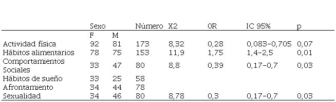 En el análisis bivariado de los estilos de vida de los adolescentes se encontró una relación estadísticamente significativa entre la actividad física, los hábitos alimentarios y el género (p=0.07 y p= 0.09, respectivamente), de igual manera existe una relación significante entre los comportamientos sociales (uso de sustancias psicoactivas o ilegales, consumo de alcohol) con el abordaje de la sexualidad (p=0.03) (OR= 0.4 IC95%0,17-0,7) considerándolos como determinantes protectores (ver Tabla 5).
