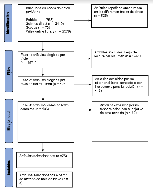 Fase 3: de los 523 artículos de la fase 2 se seleccionaron 106. Se descartaron 232, pues no aportaban de manera específica a la construcción de esta revisión y 185 porque no contaban con texto completo gratuito. Así, se leyeron 106 artículos en texto completo, de los cuales se excluyeron 80 por no tener relación con el propósito de la revisión. Finalmente, se escogieron 26 que sí cumplían los criterios de inclusión propuestos y se utilizó el método de bola de nieve. De ese modo, se realizó su revisión bibliográfica, lo que permitió encontrar ocho artículos adicionales.