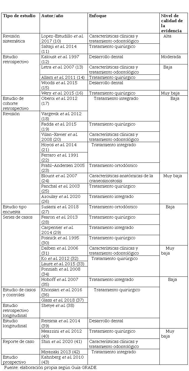Considerando que tanto el diagnóstico como el manejo clínico de pacientes con anomalías craneofaciales no constituyen procedimientos rutinarios para la odontología general, es relevante actualizar a esta y otras disciplinas. Esto a través de la revisión de la literatura disponible acerca de los aspectos principales asociados con una adecuada atención ortodóntico - quirúrgica de los sujetos con síndrome de Apert. Al efectuar el análisis de calidad de la evidencia, según el método de GRADE (9), la mayoría de artículos resultaron de baja calidad, lo cual podría explicarse por la poca prevalencia que tiene el síndrome a nivel mundial y, asimismo, a la dificultad de realizar estudios prospectivos y aleatorizados (Ver Tabla 1).