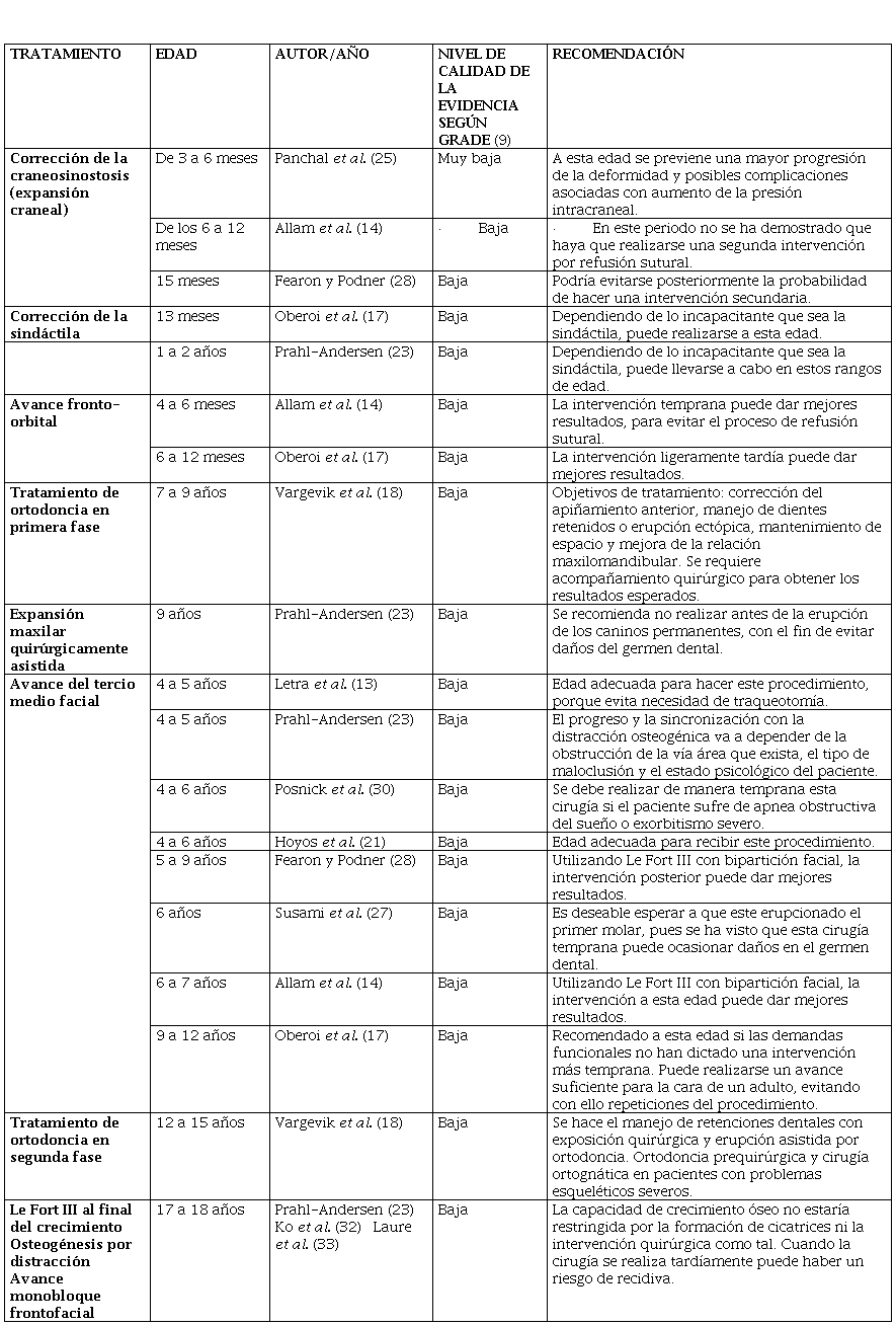 La mayor controversia entre los autores es la relacionada con el tratamiento quirúrgico. Para la corrección de la craneosinostosis se proponen tres edades. Primero, Panchal et al. (25) afirman que de 3 a 6 meses; pero es una revisión que no evidencia la metodología utilizada; Fearon y Podner (28) plantean un tiempo de 6 a 12 meses, en su estudio de series de casos, que observó la evolución de 135 pacientes operados por un mismo cirujano durante 20 años; y, por último, Allam et al. (14) proponen 15 meses en su estudio retrospectivo, en el cual registraron la evolución de los procedimientos quirúrgicos de 35 pacientes a largo plazo; todos estos estudios son de calidad baja según la guía GRADE (9).