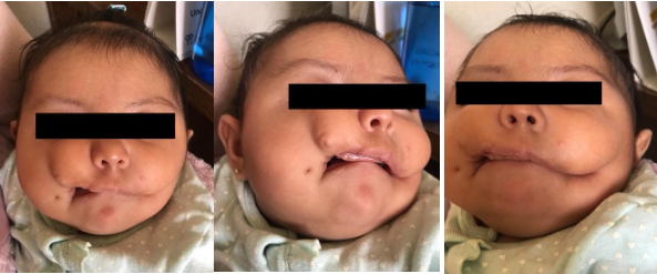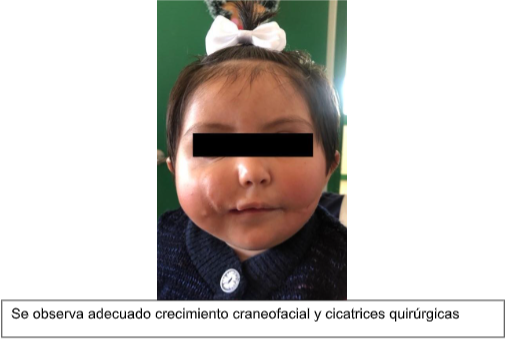 Paciente de sexo femenino de cuatro meses de edad, producto de la primera gestación, con un peso al nacimiento de 3,3 kg, talla de 51 cm, APGAR 8/9. Al momento del parto la madre tenía 26 años. La ultrasonografía prenatal regular secuencial no presentaba datos relevantes específicos que informara de alguna anormalidad fetal. Antecedentes sistémicos y perinatales de amenaza de aborto a los dos meses por infección de vías urinarias, el cual se remitió con tratamiento no especifico, sin hemorragia anteparto y toxicomanías negadas. La madre acudió al servicio de urgencias médicas de pediatría al presentar dificultad con su alimentación, por lo que se realizó interconsulta al servicio de cirugía oral y maxilofacial del Hospital del Niño DIF Pachuca, Hidalgo, México. La paciente presentaba anillo constrictivo en región geniana que se extiende desde el labio superior hasta la región infraorbitaria de lado derecho, pit paracomisural derecho y fisura Tessier 7 con mayor afectación hacia el lado izquierdo (Ver Figura 1).