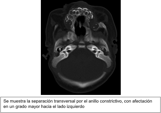 Fotografías obtenidas del Servicio de Cirugia Oral y Maxilofacial Hospital del Niño DIF, Pachuca, Hidalgo, México.Tras la examinación física intraoral, se observaron sinequias en la región de la mucosa palatina de lado izquierdo, que se extienden hasta la comisura ipsilateral sin presencia de fondo vestibular del lado derecho; también se evidenció división de forma transversal del proceso alveolar a nivel de los molares maxilares bilaterales. Se solicitó una tomografía computarizada, en la cual se observó normocéfalo con adecuada formación de las fontanelas sin afectación craneal por la banda amniótica; en la vista palatina del maxilar se identificó división del maxilar de forma transversal a nivel de los molares bilaterales (Ver Figuras 2 y 3) y región mandibular sin malformaciones.