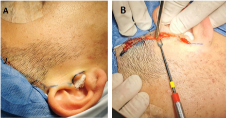 El procedimiento se llevó a cabo bajo anestesia general balanceada con intubación nasotraqueal, colocación de campos estériles, con previa asepsia-antisepsia, y protección de los conductos auditivos externos con la colocación de gasas. Se procedió también a hacer el marcaje de la zona quirúrgica de manera bilateral, para realizar un abordaje preauricular con extensión anterior-temporal, a una distancia desde el trago de 0.5 cm y con una longitud en sentido vertical de 6 cm. Posteriormente, se infiltraron de manera local 5 cc de lidocaína 2% más epinefrina 1/100.000, con el fin de realizar hemostasia de las zonas a incidir (Ver Figura 4).