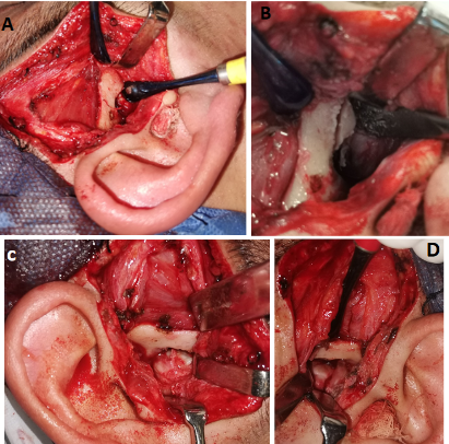 El procedimiento usualmente se realiza usando una incisión endaural, retroauricular o preauricular estándar con extensión anterior/temporal. Luego, la eminencia se reduce a su margen medial con fresas, osteotomos o una combinación de estos; el tubérculo lateral de la eminencia puede dejarse en su lugar como un plano de guía, o retirarse. El riesgo de este procedimiento es la probabilidad de daño a nivel de nervios motores correspondientes al nervio facial del área con compromiso de la movilidad del tercio medio y superior hemifacial (14).