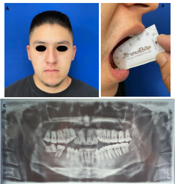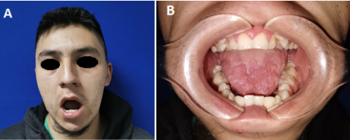 El paciente exhibía apertura bucal máxima de 46 mm, dentición permanente y mala higiene oral, con presencia de restos de alimento y lengua seborreica. No se pudo determinar su clase molar y canina, pues no era capaz de realizar oclusión dentaria en máxima intercuspidación (Ver Figura 1 B).