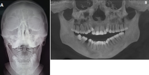 Se trataba de un paciente alerta, cooperador y ubicado en sus tres esferas neurológicas; después de la exploración física dirigida, se observó que el paciente mostraba una desarmonía dentofacial, mordida abierta, incompetencia labial y disoclusión dental. A la palpación bilateral de la ATM se identificaban dos aumentos de volúmenes en región preauricular, de consistencia dura e inmóviles (Ver Figura 1 A).