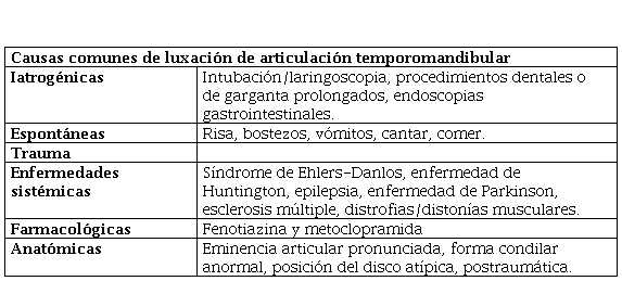 Su etiología puede ser variada, pero todas las luxaciones tienen un origen agudo que se puede generar de diversas situaciones, como la apertura prolongada durante algún procedimiento dental, vómitos, bostezos, apertura bucal excesiva para morder, etc. (8). De igual manera, se han registrado casos de luxación aguda tras crisis epilépticas, traumatismo maxilofacial, laringoscopia directa, entre otras causas (9) (Ver Tabla 1).