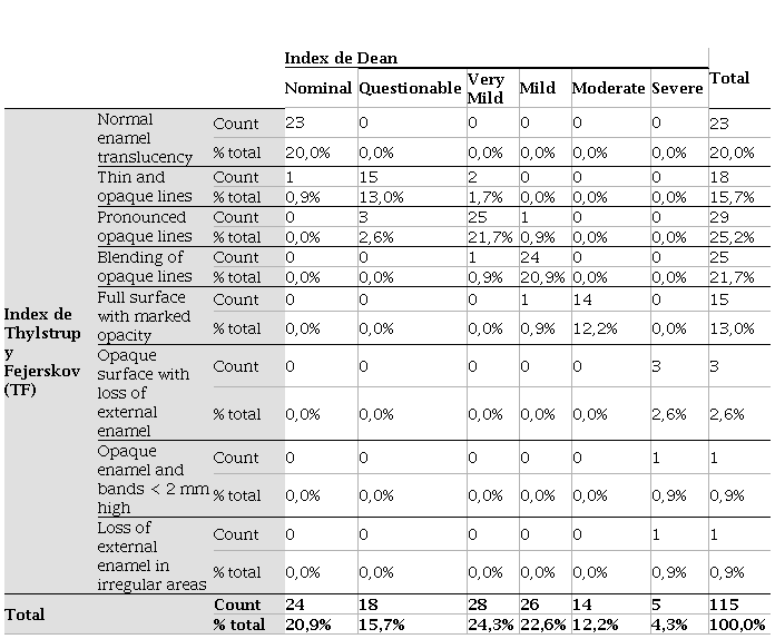 When making a comparison between the TF Index and the DEAN Index (Table 1), it has been obtained that 20.0% of those who in the Dean index are presented with a nominal level, in the scale of TF corresponds to the normal translucency of the enamel, likewise, the questionable level that has 15.7% on the Dean scale, coincides in 13% with the level of thin and opaque lines of the TF scale and 2.6% with pronounced opaque lines.