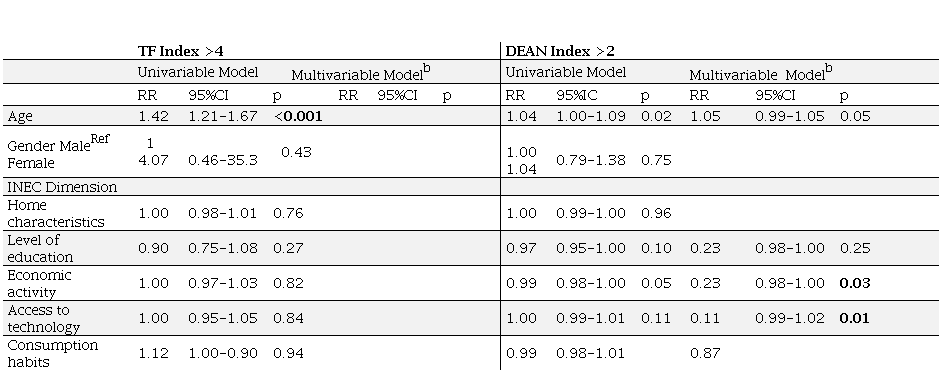In the multivariate model, significant associations were observed between the dimensions of economic activity (p=0.03), access to technology (p=0.01), and DEAN fluorosis index (Table 3). In the correlation analysis between the TF and Dean indices, a correlation of 0.97 was observed, which was considered optimal.