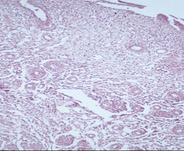 Se observa discontinuidad epitelial e infiltrado eosinofílico del estroma. Hematoxilina-eosina, x10