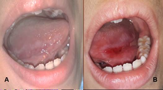 Se procedió a ejecutar un esquema de tratamiento inicial que incluyó: higiene bucal minuciosa, pulido de las cúspides linguales de molares mandibulares, aplicación de triamcinolona tópica (Quimefa.) tres veces por día sobre lesiones (Véase Imagen 3), administración oral de difenhidramina (25 mg) Quimefa. cada 12 horas durante siete días, y su reevaluación en 7 días. Este esquema de tratamiento se mantuvo durante 15 días y se efectuó la evaluación clínica de las lesiones valorando sus características clínicas y midiendo su tamaño con pie de rey durante todo el tratamiento.