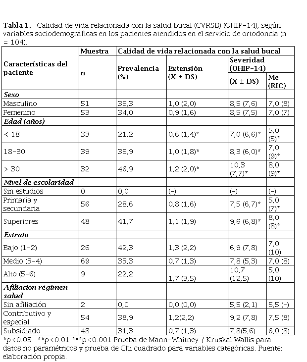 Se evaluaron en total 104 pacientes. El promedio de edad de los pacientes fue de 25,7 ± 12,1 años, una edad mínima de 12 y máxima de 60 años. Del total de la población el 34,6% reportó impacto de la CVRSB con ítems que reportaban entre frecuentemente y siempre en el OHIP. Se encontraron diferencias estadísticamente significativas según la edad y el nivel de escolaridad, principalmente en la extensión y la severidad del impacto en la calidad de vida (Tabla 1).