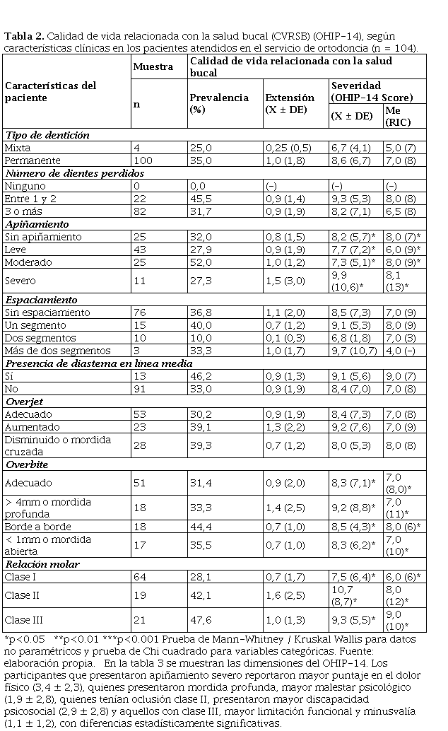En la tabla 2 se muestran las variables clínicas de tratamiento y se observa que el mayor puntaje del OHIP-14 lo presentaron aquellos participantes con apiñamiento severo (8,1 RIC=13), mordida borde a borde (8,0 RIC=6) y relación molar clase III (9,0 RIC=10), con diferencias estadísticamente significativas.