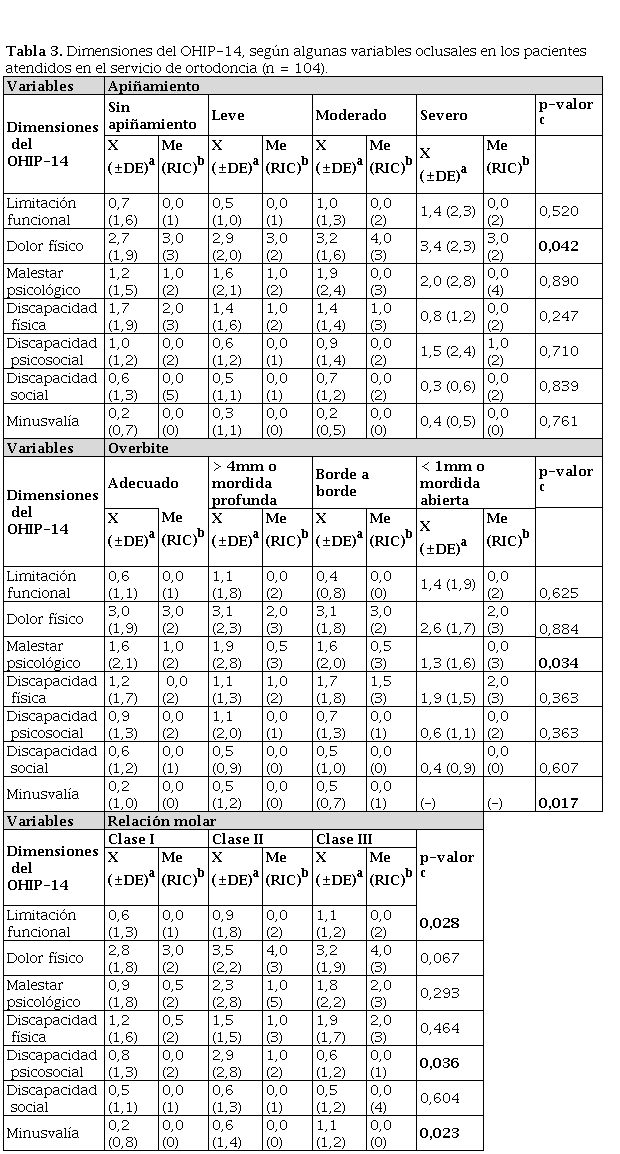 En la tabla 3 se muestran las dimensiones del OHIP-14. Los participantes que presentaron apiñamiento severo reportaron mayor puntaje en el dolor físico (3,4 ± 2,3), quienes presentaron mordida profunda, mayor malestar psicológico (1,9 ± 2,8), quienes tenían oclusión clase II, presentaron mayor discapacidad psicosocial (2,9 ± 2,8) y aquellos con clase III, mayor limitación funcional y minusvalía (1,1 ± 1,2), con diferencias estadísticamente significativas.