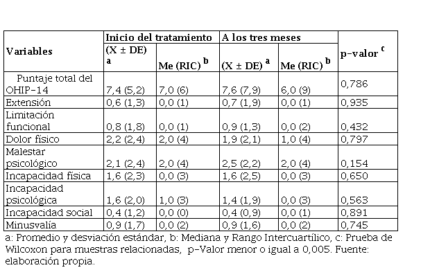 En la tabla 4 se observan los resultados del estudio piloto de seguimiento a 61 pacientes que fueron evaluados al inicio y a los tres meses de estar en el tratamiento de ortodoncia. Se observa una disminución en le mediana del puntaje total del OHIP, dolor físico e incapacidad psicológica, las demás dimensiones no presentaron cambios. Lo anterior sin diferencias estadísticamente significativas.