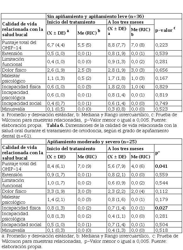 Se analizó el cambio que tuvo el puntaje del OHIP-14 y sus dimensiones con relación al grado de apiñamiento y se observó que hubo diferencias estadísticamente significativas en el puntaje total del OHIP al inicio y a los tres meses de tratamiento, el cual tuvo una disminución, así como en la dimensión de incapacidad física (Tablas 5 y 6).