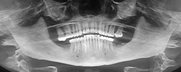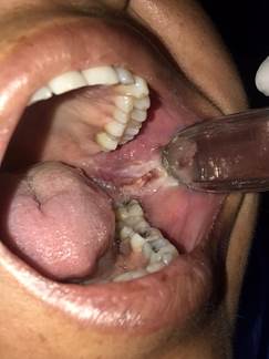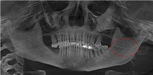 Una paciente de 54 años, con antecedentes sistémicos de HAS, bajo tratamiento médico con amlodipino, 5 mg cada 12 horas (1-0-1), sin alergias a medicamentos, acude por medio de urgencias al servicio de Cirugía Oral y Maxilofacial del Hospital Regional “General Ignacio Zaragoza”, del Instituto de Seguridad y Servicios Sociales de los Trabajadores del Estado (ISSSTE) en la Ciudad de México. El motivo de la consulta fue haber sufrido un accidente intrahospitalario, posterior a un tratamiento odontológico, que ocasionó el alojamiento de una aguja dental fracturada en el espacio retromolar del lado izquierdo, con fracaso en el intento de retirar el objeto extraño (Figura 1). La mujer refería dolor exacerbado en la zona pterigomandibular, temporal y cervical, el cual incrementaba al realizar movimientos de apertura y cierre de la cavidad oral, por lo que se decidió realizar la extracción del fragmento de la aguja fracturada.