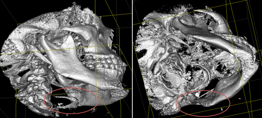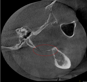 La paciente estuvo bajo vigilancia en el servicio de urgencias hasta la regulación de la TA en valores dentro de los parámetros normales. Posterior al manejo médico y terapéutico, se decidió continuar el acto quirúrgico. Se le practicó un estudio de tomografía computarizada, tipo cone beam (Figura 5), donde se ubicaba la aguja, entre la parte lateral del músculo pterigoideo medial y la parte medial de la rama mandibular. Así, sin incidentes ni complicaciones se retiró el objeto extraño (Figura 6) y se afrontó la herida quirúrgica con puntos de sutura de ácido poliglicólico 3-0. A la paciente se le prescribió clindamicina 300 mg vía oral, cada 6 horas por 7 días, y diclofenaco 100 mg, cada 12 horas por 7 días. Después de dar cuidados postoperatorios y termoterapia, la paciente acudió a cita posquirúrgica en una semana y refirió un mínimo malestar y edema postoperatorio, con herida en vía de cicatrización, sin complicaciones.