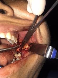 Con consentimiento informado firmado, se monitorearon signos vitales (temperatura de 36.6 ºC, frecuencia cardíaca de 88 latidos por minuto y la respiratoria de 22 respiraciones por minuto; la tensión arterial fue de 133/91 mmHg y la oximetría de pulso de 95 %). Después de realizar la correspondiente asepsia y antisepsia, se colocaron campos estériles de manera protocolaria y se eligió lidocaína 2 % con epinefrina 1:100.000, para bloqueo del nervio alveolar inferior, el nervio largo bucal, así como el nervio alveolar superoposterior. Esta elección se hizo debido a que este anestésico permite un adecuado tiempo de trabajo (1.5 a 3 horas) y es ideal para procedimientos en tejidos blandos de la cavidad oral. Se llevó a cabo un estudio tomográfico, tipo cone beam (Figura 2), para la ubicación espacial de la aguja fracturada. Luego, se incidió con electrobisturí monopolar en la región retromolar a nivel del borde anterior de la rama mandibular (Figura 3), mediante un colgajo de espesor total (Figura 4).
