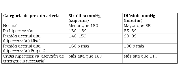 De ese modo, un aumento rápido, marcado y persistente de los niveles de tensión arterial (TA), por encima de 180/120 mmHg, representa una condición clínica. Esta es definida en las guías de la Asociación Americana del Corazón (AHA, por sus siglas en inglés) como una emergencia hipertensiva, en presencia o ausencia de signos agudos de daño orgánico (3,4). En la Tabla 1 se muestra la clasificación actual de la hipertensión, según las guías de 2020 de la AHA.