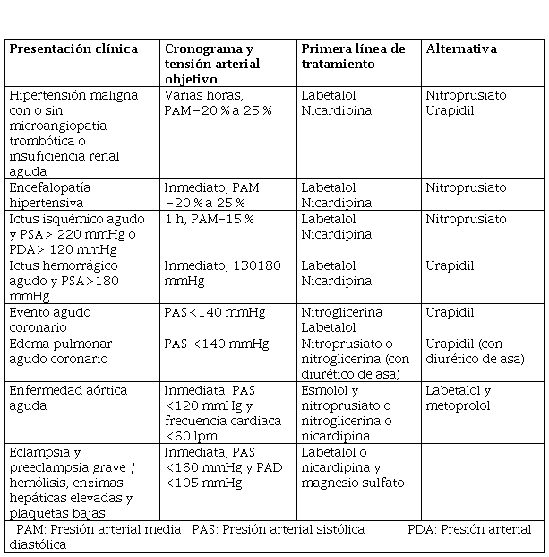En la emergencia hipertensiva, se debe considerar un descenso paulatino de la TA, debido a que, si este es brusco, puede rebasar el límite permitido de autorregulación, con la consiguiente isquemia de los lugares que están siendo comprometidos, todo lo cual ocasionaría un aumento en el área de necrosis. En las primeras 24 horas, solo en caso de PAS superior a 220 mmHg o de PAD superior a 120 mmHg, es necesario administrar tratamiento antihipertensivo, procurando un descenso lento y gradual (23).