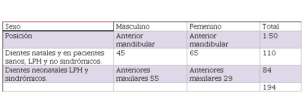 En una serie de casos investigada en el 2008 con población mexicana (San Luis Potosí del hospital Morones Prieto) se detectó una incidencia de 1:50 de los 2182 pacientes examinados con una proporción de 1:2 para hombres y 1:3 mujeres (19). En nuestro estudio la frecuencia de dientes natales y neonatales encontrada fue de 3.54% con 45 masculinos y 65 femeninos, todos ubicados en la región anterior mandibular, situación similar a lo reportado internacionalmente. Y de 1.53% en pacientes con LPH y con dientes neonatales localizados en la región maxilar superior, 55 masculinos y 29 femeninos. La muestra final fue de 194 pacientes en una población total de 5475 nacimientos en un año.