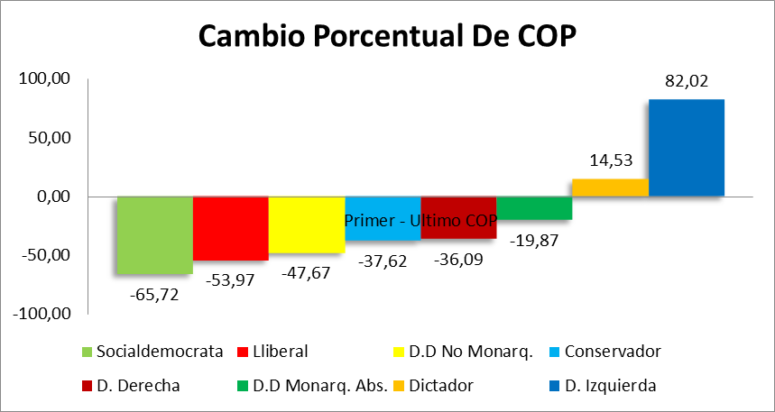 COP en países con gobiernos dictatoriales: en este grupo se observan cambios diversos y complejos en la incidencia de caries en lo transcurrido del tiempo, medidos por el índice COP. Se evidencia que algunos países experimentan una disminución superior al 50%, y otros, al contrario, un crecimiento que supera el 100%. Sin realizar una subdivisión específica dentro de este grupo, se destaca que Nigeria es el país con mejor rendimiento en términos de disminución, con una reducción del 77%. Por otro lado, Corea es el país con un comportamiento menos favorable, presentando un marcado crecimiento del 408%. De igual manera, Zimbabue, Yemen y Benín son países que presentan crecimiento en el índice de COP. Un aspecto novedoso de este estudio fue la realización de una subdivisión dentro de este grupo, considerando dictaduras de derecha (militares o monárquicas), dictaduras de izquierda y dictaduras con monarquías absolutistas. Las diferencias de comportamiento para estas trayectorias políticas en relación con los índices de COP proporcionan información que debe ser profundizada en futuros estudios.