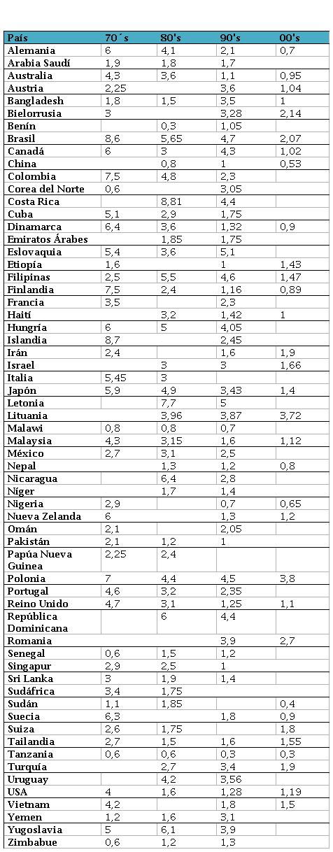 Considerando el objetivo establecido, la hipótesis inicial postula que los países con una mayor experiencia en condiciones políticas democráticas mostrarán mejores resultados en términos del índice COP, en comparación con aquellos países menos democráticos. Para su abordaje, se diseñó un estudio ecológico retrospectivo exploratorio, acorde con la declaración STROBE para estudios observacionales. Se incluyeron 62 países (Tabla 1) que tuvieron, al menos, dos registros nacionales de COP a los 12 años de edad durante el periodo de cuatro décadas, años 1970 a 2000 (21–28).