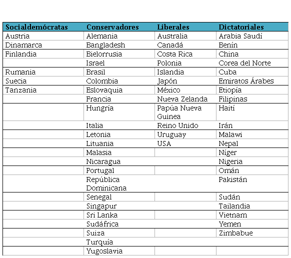 Para la caracterización del régimen político se revisaron páginas oficiales del Banco Mundial, de la Agencia Central de Inteligencia de Estados Unidos (CIA), la Organización Mundial de la Salud y del Fondo Monetario Internacional, en los que se indagó por las características de los regímenes y partidos políticos en los gobiernos de los países seleccionados durante el periodo estimado. A partir de esta revisión, se tipificaron a los países en cuatro categorías: países con gobiernos socialdemócratas, países con gobiernos conservadores (demócratas cristianos), países con gobiernos liberales y países con sistemas dictatoriales o autoritarios (que incluye dictaduras militares, monarquías absolutistas, teocracias o los países gobernados por partidos comunistas). Esta tipificación se determinó a partir de la cantidad de años (la mitad más uno, como mínimo) en la que un régimen político estuvo gobernando cada país.