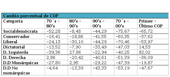 Relación entre los sistemas políticos y el índice COP en 62 países durante el periodo 1970-2010