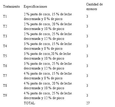 Las unidades de análisis fueron envases de 750 mililitros de licor. Se usaron diferentes proporciones de pasta de coco (Cocos nucifera L.), leche descremada y pisco. Se aplicaron nueves tratamientos, los cuales se describen en la tabla 1.