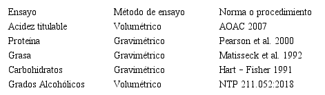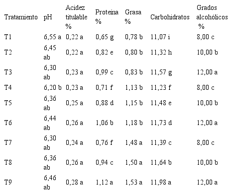En la tabla 5 se observa de forma general que no existieron diferencias significativas (p > 0,05) en el pH y la acidez titulable, pero sí en cuanto a las proteínas, grasas, carbohidratos y grado alcohólico. De acuerdo con el análisis, las propiedades que se vieron afectadas por los tratamientos fueron la cantidad de proteínas y de carbohidratos, por ser donde más se presentaron grupos homogéneos.